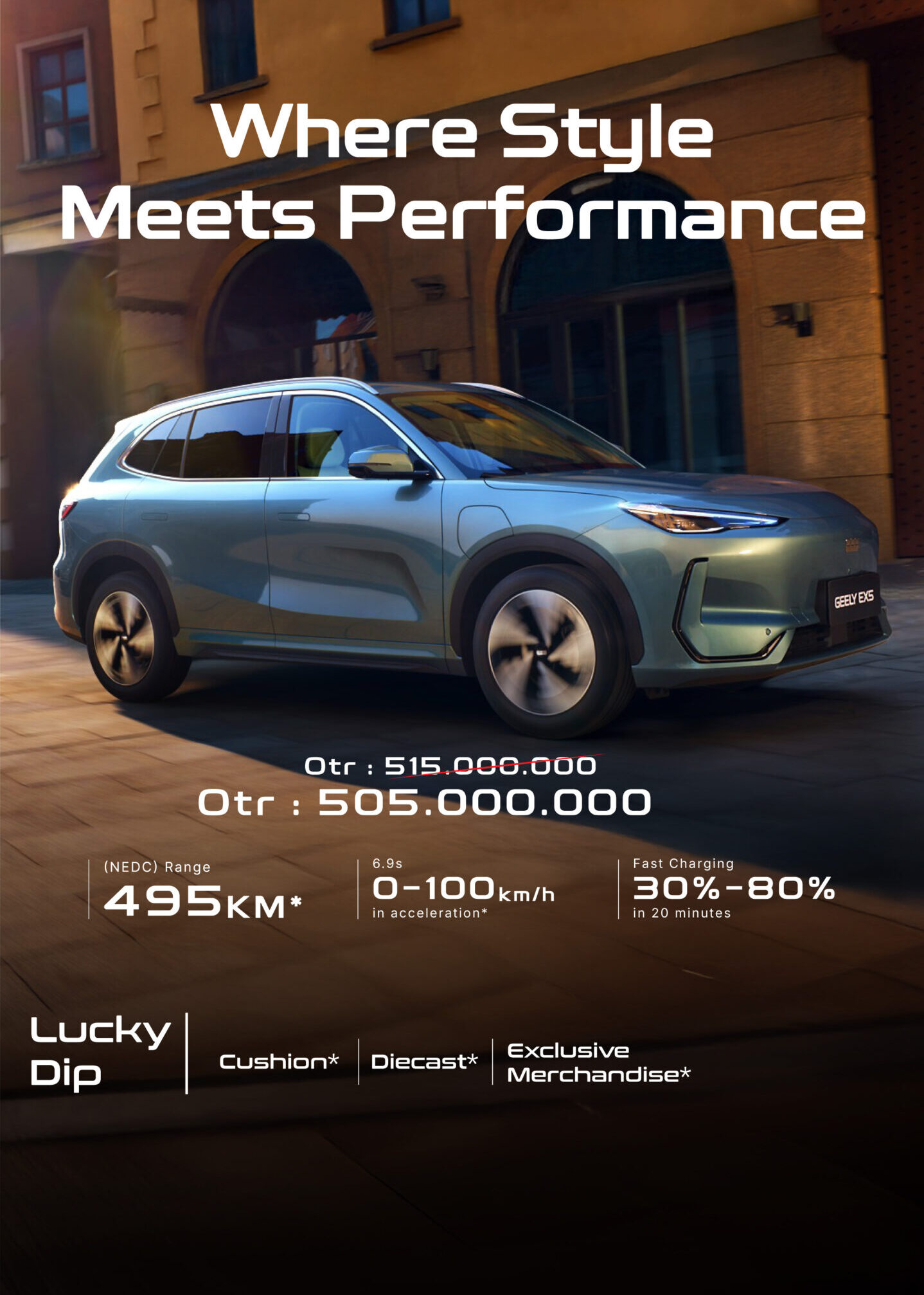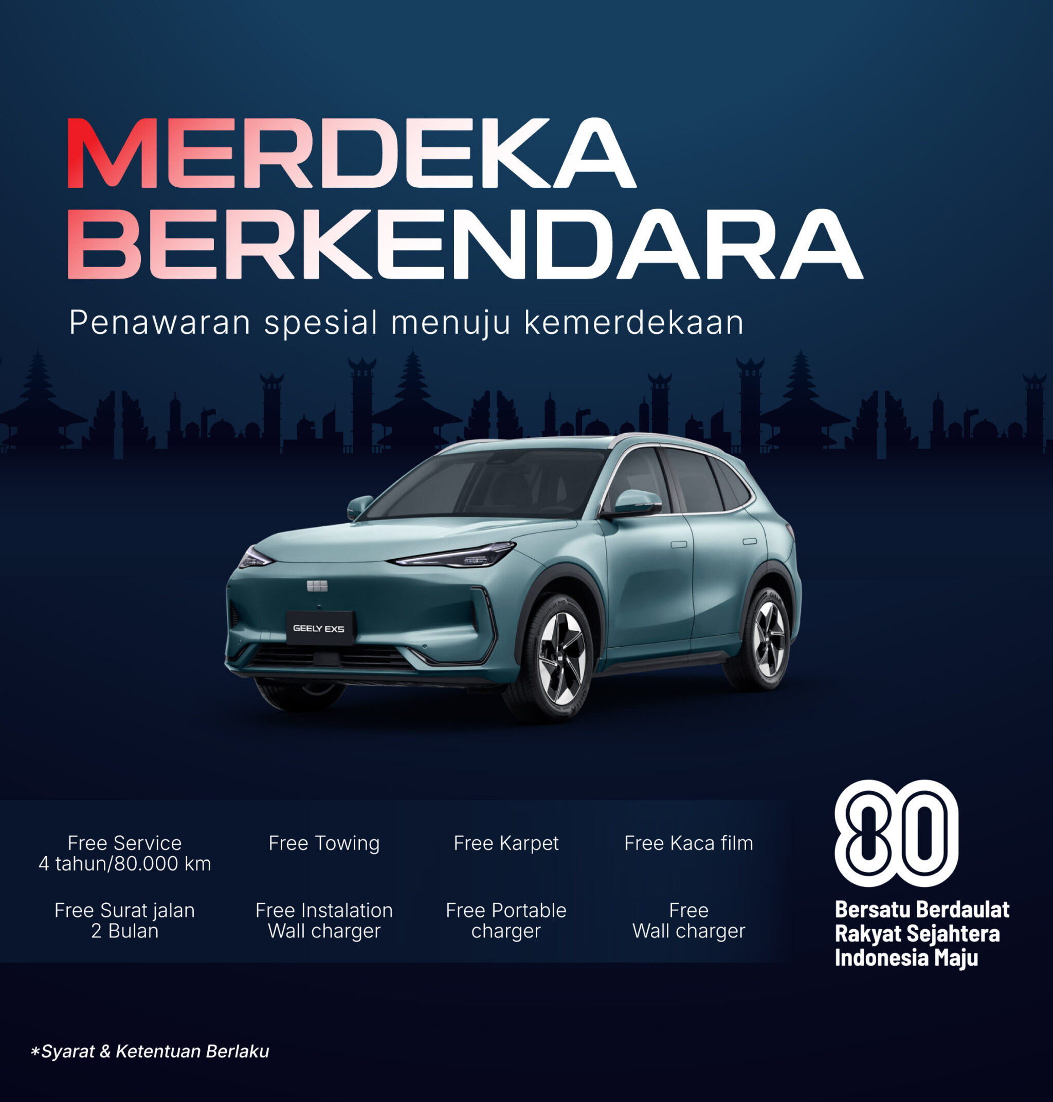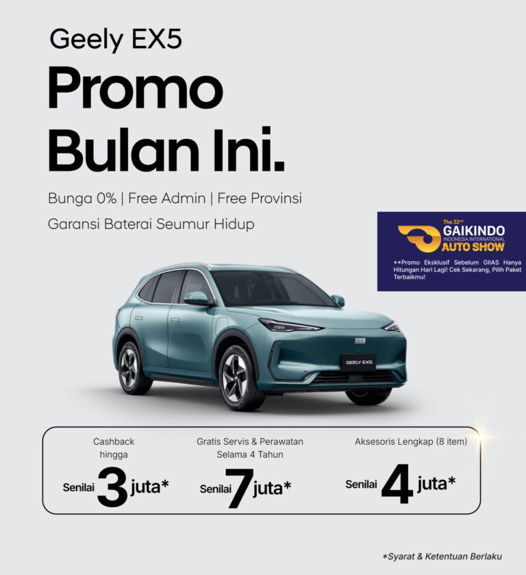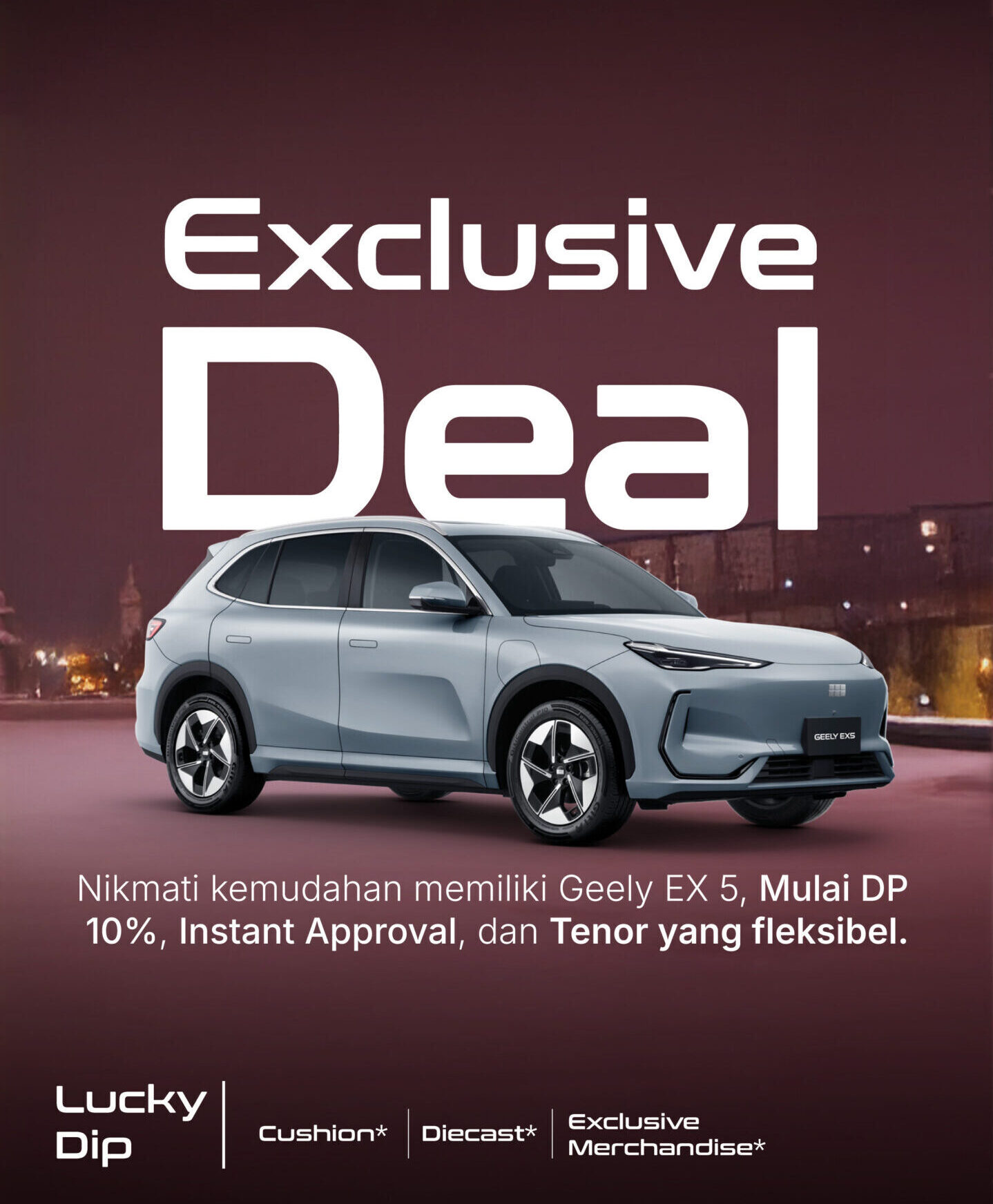 Geely EX5 adalah mobil listrik pintar dari Geely yang dirancang untuk mobilitas modern. Dilengkapi fitur canggih, desain futuristik, dan tenaga listrik penuh yang ramah lingkungan.